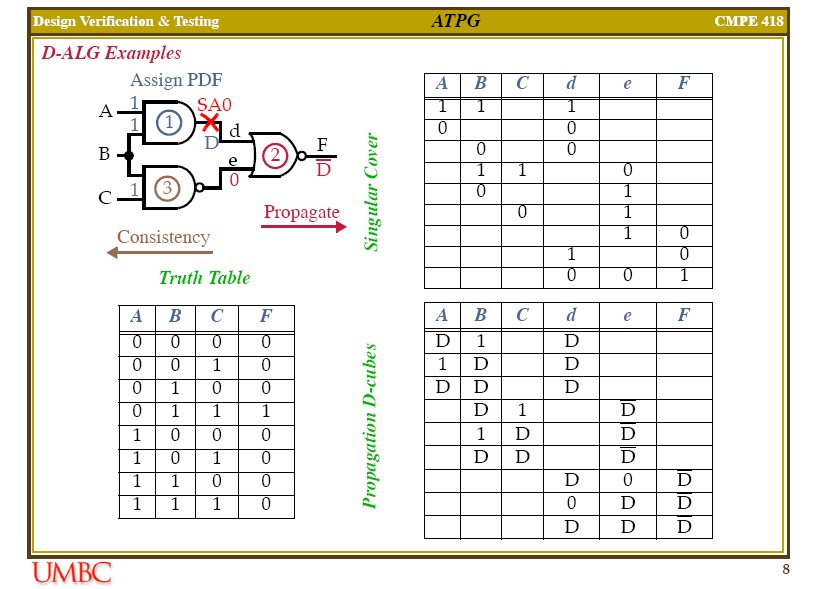 - D Algorithm 底下是 D algorithm 的Sample, 主要分成 Propagate, Consistency. Propagate : 有點像是 Forward 的方式把Data Propagate 下去,直到我們的Flip -Flop端. 在經由我們的JTAG 做Debug的動作. Consistency: 像是Back Track的方式, 回頭去定義我們的Input vector. 底下的Sample中. 假設在Wire d被 Tied住成 0 (SA0), 如何用D algrithm找出解呢?